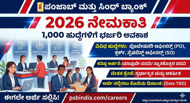 Bank ಬ್ಯಾಂಕಿಂಗ್ ಕ್ಷೇತ್ರದಲ್ಲಿ ಭಾರೀ ಉದ್ಯೋಗಾವಕಾಶ Bank ಇತ್ತೀಚಿನ ದಿನಗಳಲ್ಲಿ ಸರ್ಕಾರಿ ಬ್ಯಾಂಕ್ ಉದ್ಯೋಗಗಳಿಗೆ ಬೇಡಿಕೆ ಹೆಚ್ಚಾಗುತ್ತಿರುವ ಸಂದರ್ಭದಲ್ಲಿ, ಪಂಜಾಬ್ ಮತ್ತು ಸಿಂಧ್ ಬ್ಯಾಂಕ್ ವತಿಯಿಂದ 2026ನೇ …
