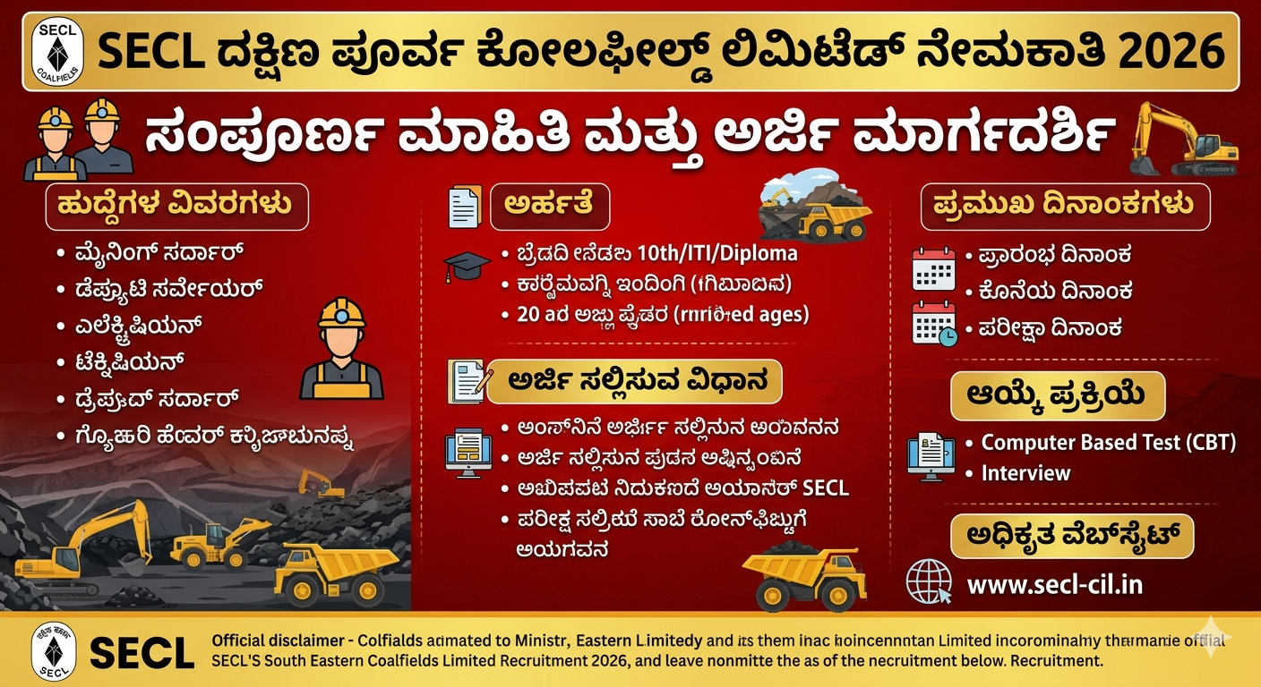 SECL ನೇಮಕಾತಿ 2026 ಕುರಿತ ಸಂಪೂರ್ಣ ಮಾಹಿತಿ, ಅರ್ಹತೆ, ವಯೋಮಿತಿ, ಅರ್ಜಿ ವಿಧಾನ, ಆಯ್ಕೆ ಪ್ರಕ್ರಿಯೆ ಹಾಗೂ ಪ್ರಮುಖ ದಿನಾಂಕಗಳ ವಿವರಗಳನ್ನು ಇಲ್ಲಿ ತಿಳಿದುಕೊಳ್ಳಿ
