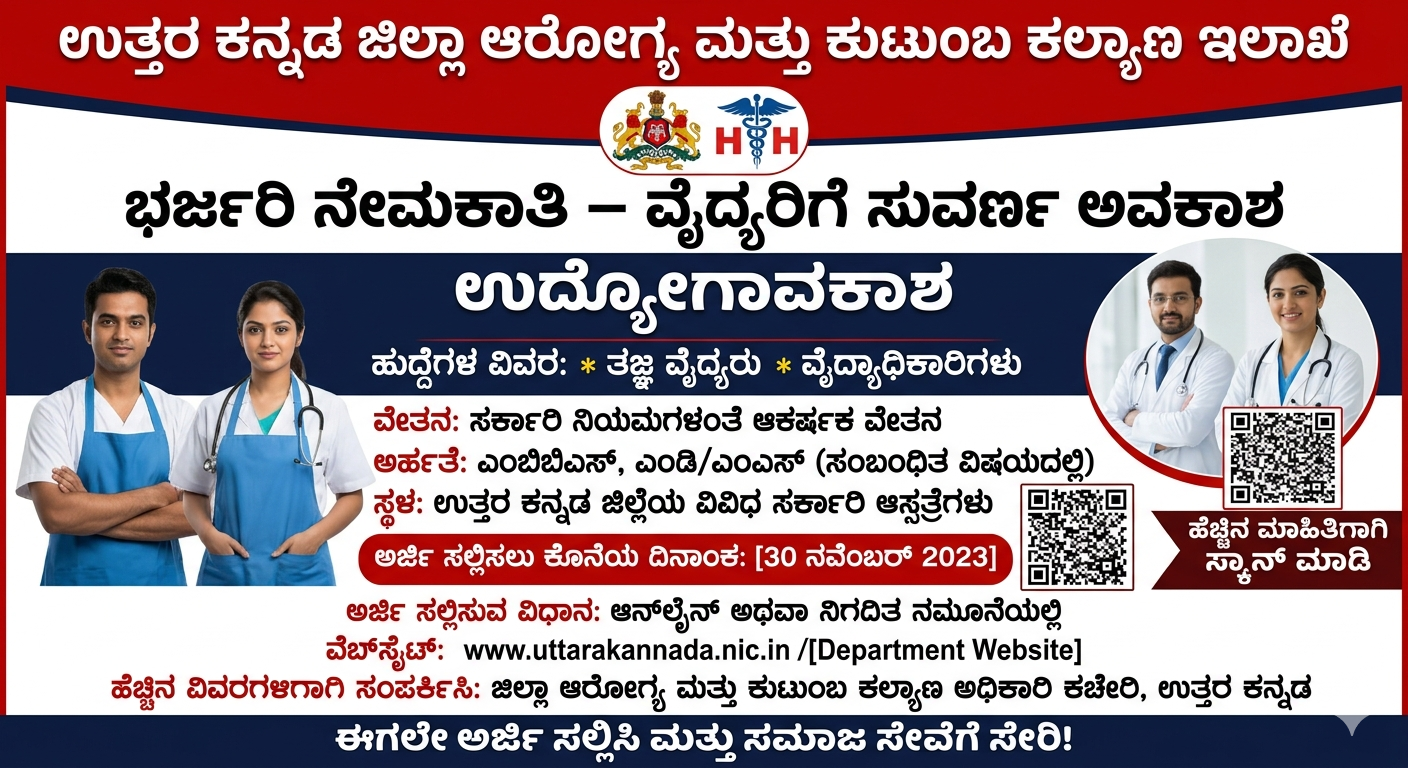 Job ಉತ್ತರ ಕನ್ನಡ ಜಿಲ್ಲೆಯ ಆರೋಗ್ಯ ಕ್ಷೇತ್ರದಲ್ಲಿ ತಮ್ಮ ವೃತ್ತಿಜೀವನವನ್ನು ನಿರ್ಮಿಸಿಕೊಳ್ಳಲು ಬಯಸುವ ವೈದ್ಯಕೀಯ ಕ್ಷೇತ್ರದ ಅಭ್ಯರ್ಥಿಗಳಿಗೆ ಇದೀಗ ಅತ್ಯಂತ ಮಹತ್ವದ ಅವಕಾಶ ಲಭ್ಯವಾಗಿದೆ. ಜಿಲ್ಲಾ ಆರೋಗ್ಯ ಮತ್ತು ಕುಟುಂಬ ಕಲ್ಯಾಣ ಸಂಘದಿಂದ ಖಾಲಿ ಇರುವ ತಜ್ಞ ವೈದ್ಯರು ಮತ್ತು ತುರ್ತು ವೈದ್ಯಕೀಯ ಅಧಿಕಾರಿಗಳ ಹುದ್ದೆಗಳನ್ನು ಭರ್ತಿ ಮಾಡಲು ಅಧಿಕೃತ ಅಧಿಸೂಚನೆ ಹೊರಬಿದ್ದಿದ್ದು, ಇದು ಯುವ ವೈದ್ಯರಿಂದ ಹಿಡಿದು ಅನುಭವ ಹೊಂದಿದ ತಜ್ಞರಿಗೂ ಉತ್ತಮ ವೇದಿಕೆಯಾಗಲಿದೆ. ಸರ್ಕಾರಿ ಕ್ಷೇತ್ರದಲ್ಲಿ ಸೇವೆ ಸಲ್ಲಿಸಲು ಬಯಸುವವರಿಗೆ ಈ ಅವಕಾಶವು ಭದ್ರ ಭವಿಷ್ಯ ಮತ್ತು ಸಾಮಾಜಿಕ ಗೌರವವನ್ನು ನೀಡುವಲ್ಲಿ ಪ್ರಮುಖ ಪಾತ್ರವಹಿಸುತ್ತದೆ.